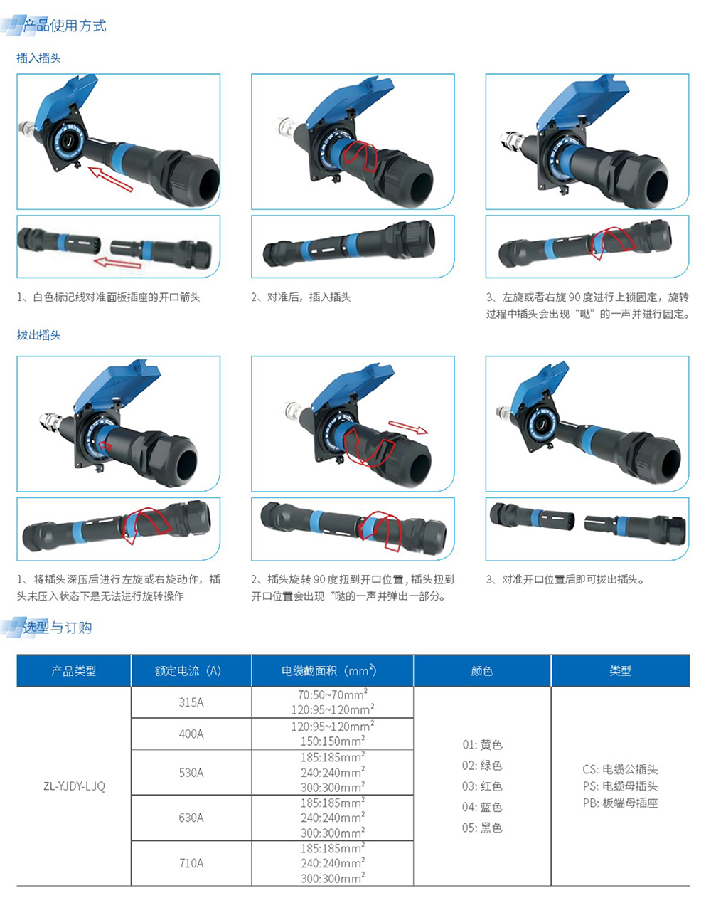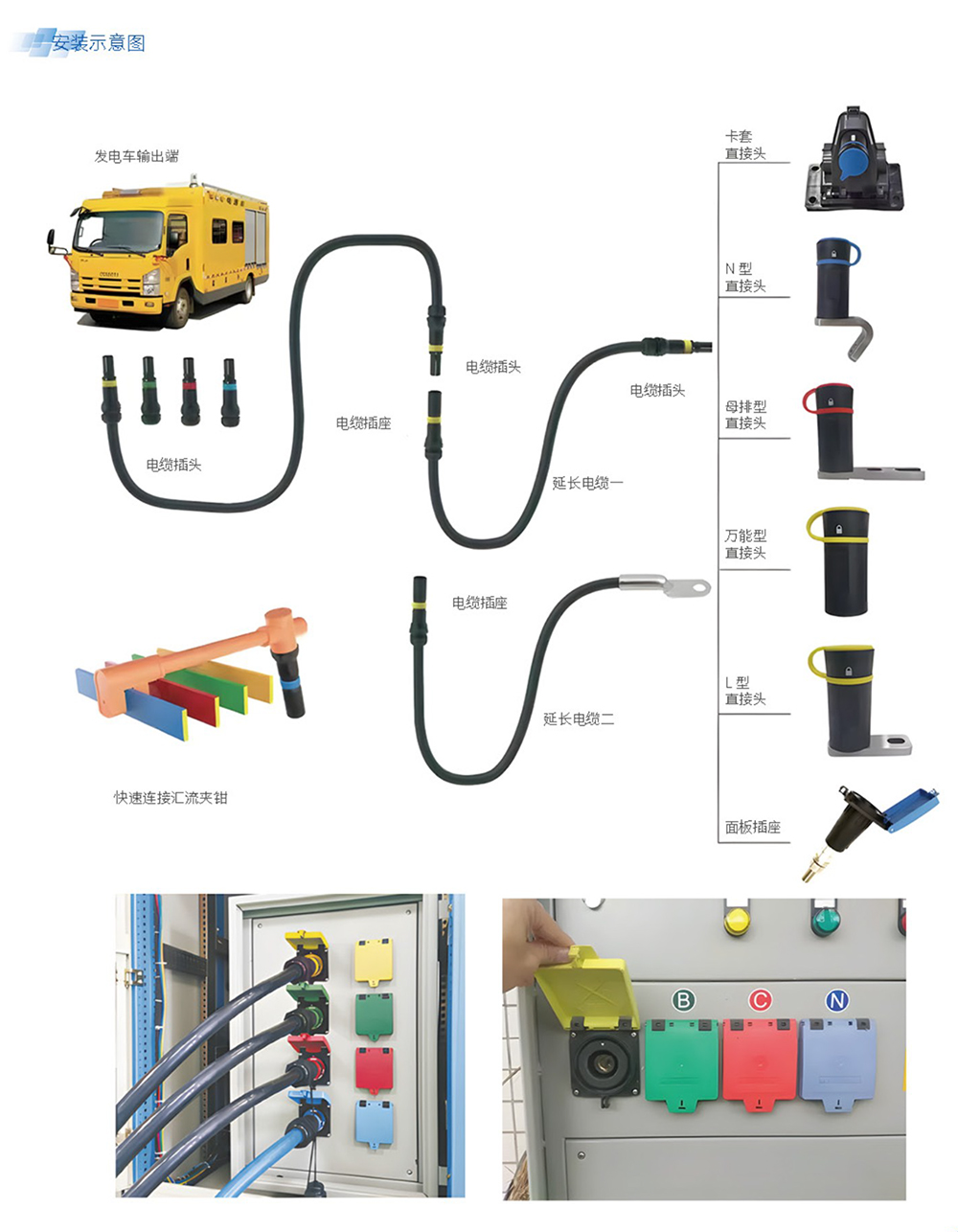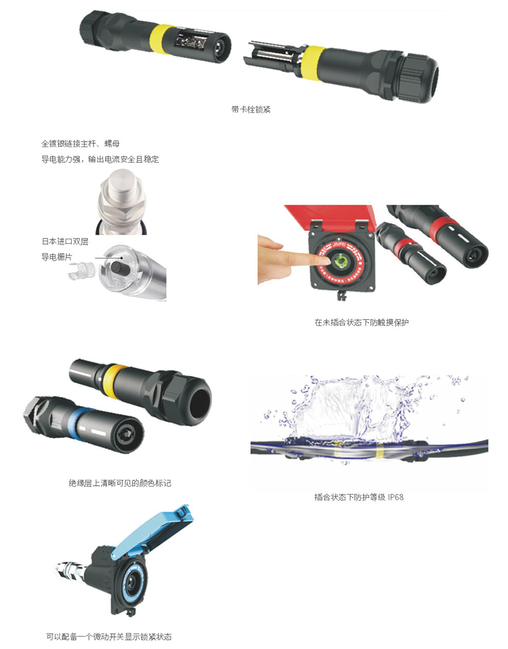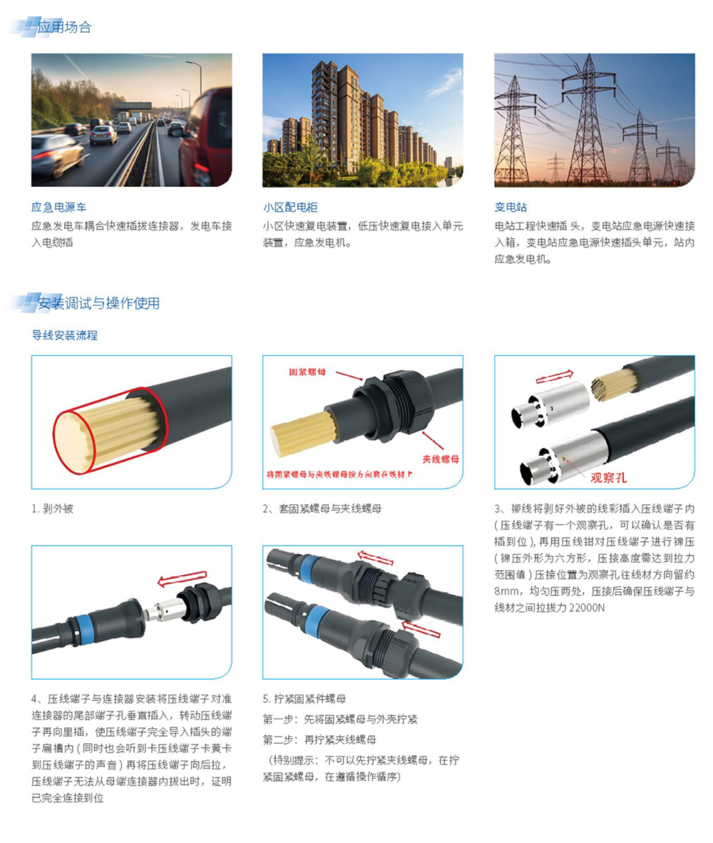 ZL-YJDY-LJQ低壓快速應(yīng)急插頭/插座分為:電纜公插頭、電纜母插頭和板端母插座,電纜母插頭用于電源車端電纜的連接,可以和電纜公插頭對(duì)接使用,電纜插頭插座和電纜連接采用壓接方式,板端插座安裝與配電柜上,和導(dǎo)線采用螺母螺柱緊固方式。公括頭插入母插座時(shí),公插頭的銅柱和插座銅柱圓孔中彈性表帶式多點(diǎn)接觸的觸指結(jié)構(gòu)配合,實(shí)現(xiàn)有壓力的多點(diǎn)接觸,形成可靠的導(dǎo)電通路,公插頭插入到位后,旋轉(zhuǎn) 90 度實(shí)現(xiàn)鎖緊,防止連接器意外斷開連接。